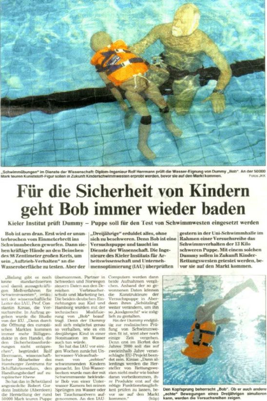 Für die Sicherheit von Kindern geht Bob immer wieder baden Kieler Institut prüft Dummy - Puppe soll für den Test von Schwimmwesten eingesetzt werden