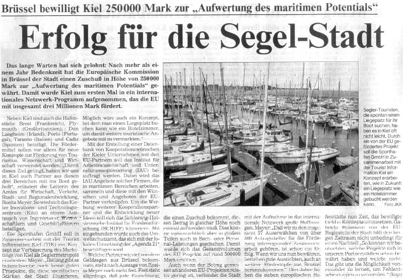 Erfolg für die Segelstadt Brüssel bewilligt Kiel 250.000 DM zur Aufwertung des Maritimen Potentials